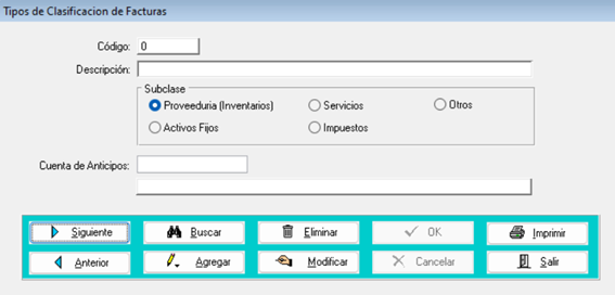 - Para agregar un nuevo tipo de clasificación de facturas, presione el botón “Agregar” y en el espacio de descripción escriba el nombre de esta, luego seleccione la subclase e ingrese la cuenta de anticipos que estará ligada. Para guardar presione el botón “Ok”.