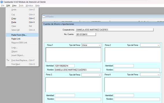 Para ingresar la imagen de la firma, se deberá hacer clic en el botón de la esquina superior izquierda “Edit” y luego “Paste from file”, esta acción le llevará a visualizar las imágenes ya guardadas en el computador del oficial de atención, y es ahí donde deberá seleccionar la imagen de la firma correspondiente.