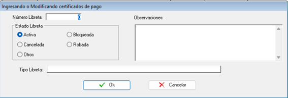 Y deberemos ingresar el número de libreta que ya ha sido asignada a esta cuenta. Luego deberá seleccionar el estado de “Activa” para una libreta nueva. En observaciones deberá ingresar información pertinente a esta apertura. Para finalizar deberá presionar el botón “OK” y quedará activa la libreta.