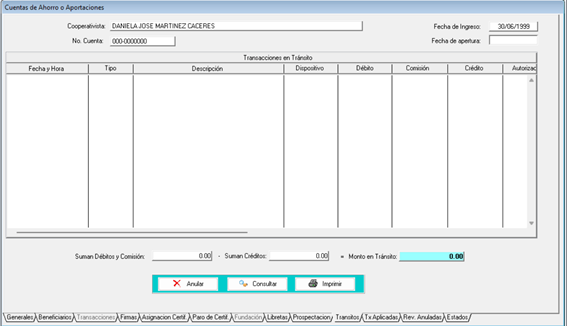 · Visualizar transacciones en tránsito. Para poder consultar o anular una transacción en tránsito deberá seleccionar la cuenta del afiliado, y dirigirse a la pestaña llamada “Tránsitos” ahí se desplegará la siguiente pantalla: