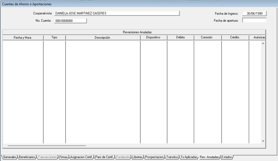 · Visualizar reversiones anuladas: En este apartado se podrá visualizar cuáles han sido las reversiones anuladas en una determinada cuenta del afiliado. Al ingresar a la pestaña de “Rev. Anuladas” aparecerá la siguiente pantalla: