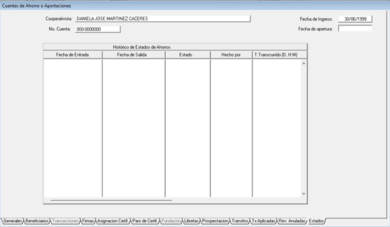 · Visualizar histórico de estados de ahorro: Por medio de este apartado, tendrás la opción de consultar el histórico de estados de ahorro en la cuenta del afiliado. Al acceder a la sección de "Estados", en una determinada cuenta, se mostrará la siguiente interfaz: