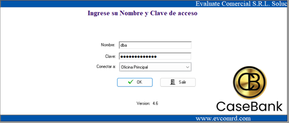 Para acceder al sistema, deberá ingresar su usuario, contraseña y sucursal en la página principal, tal como se muestra a continuación, y luego presionar en el botón “OK”: