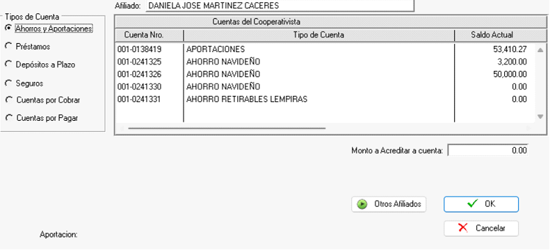 - Para poder generar este cheque, primero deberá dirigirse al botón de “Agregar” que se encuentra en la parte inferior de la pantalla. Esto abrirá la ventana de búsqueda del cooperativista, en ella, debe ingresar el código o el nombre del afiliado a quien se realizará el cheque y presionar la tecla TAB en su teclado, luego seleccione al afiliado que corresponde y de las cuentas que aparecerán a continuación, seleccione la que aplicará para este cheque.