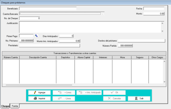 En esta pestaña se puede generar el cheque de un afiliado que haya solicitado un préstamo.