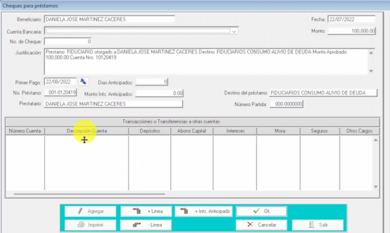 A continuación, aparecerá una pantalla en la que se muestra el monto aprobado original, el monto que ya ha sido otorgado y usted deberá ingresar el monto a otorgar en este cheque. Luego el botón “Ok”.