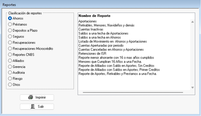 Para comenzar deberá seleccionar de la lista de la izquierda, cual es la clasificación de los reportes que necesita, luego, seleccionar del listado de la derecha el nombre del reporte a generar. Seguidamente presione sobre el botón “Imprimir” y dependiendo de cada reporte se le solicitará información que deberá completar, esta puede ser período en el cual desea que se genere el reporte, saldos, filiales, tipos de cuenta, fondos, etc.