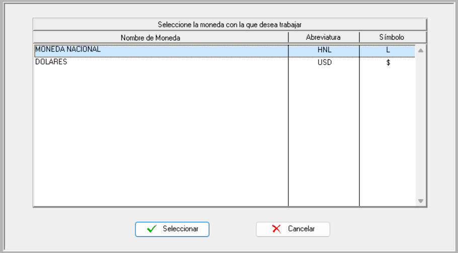 Al ingresar deberá seleccionar la moneda con la que desea trabajar, ya sea nacional o dólares, y luego presionar el botón “Seleccionar”.