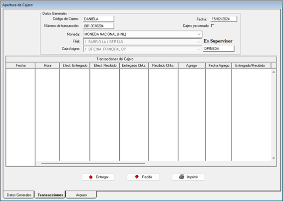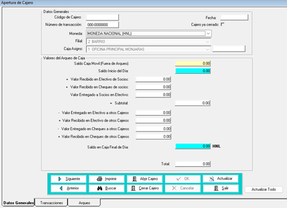 En esta pestaña se realiza la apertura del cajero para iniciar las transacciones del día en el sistema Casebank.