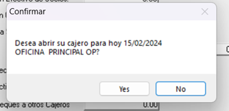 Para abrir el cajero deberá en primer lugar verificar que los datos de la pestaña de arriba estén correctos, es decir, el código del cajero, la moneda, la filial y la caja asignada. Seguidamente deberá presionar sobre el botón “Abrir cajero” y el sistema presentará la siguiente ventana: