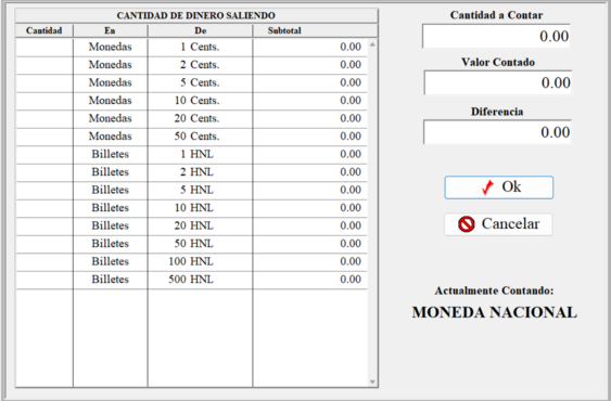 En la columna de cantidad que se encuentra en la parte izquierda, deberá ingresar la cantidad de billetes o monedas que se están entregando (fijarse bien de colocarse en la fila correcta). Ejemplo: Si entregará 500 lempiras con 5 billetes de 100, debe colocarse en la fila de Billetes – 100 Moneda Nacional y en cantidad, ingresar el número 5.