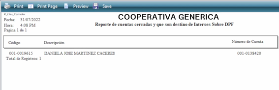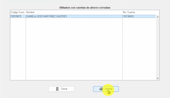 En esta podemos observar los afiliados con cuentas de ahorro cerradas, su número de cuenta y el código del socio.