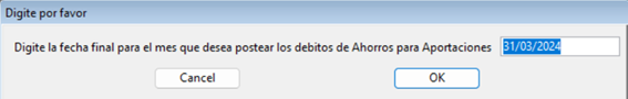 A continuación, deberá ingresar la fecha final para el mes que desea postear los débitos de ahorros para aportaciones y presionar el botón “OK”. Seguidamente, se le consultará si desea aplicar los débitos a las cuentas inactivas y deberá seleccionar el botón “Yes”
