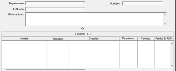 En la parte inferior de la pantalla podemos observar un cuadro de “Familiares PEPs”. Si necesita agregar a un familiar de esta persona que estamos agregando, deberá presionar el botón "Archivo" y cerciorarse que la flecha del medio esté indicando para abajo, de esta forma: