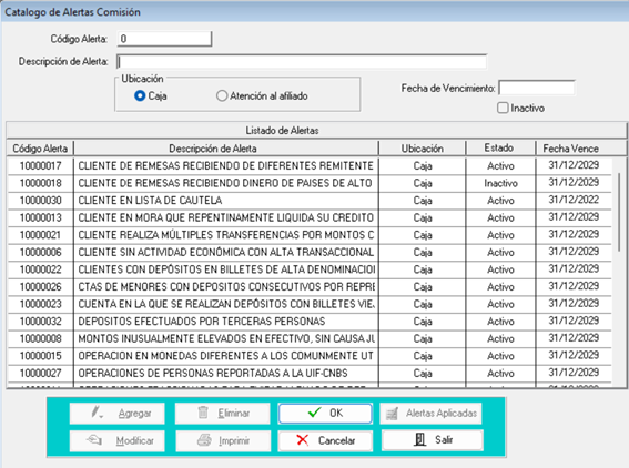 - Para agregar una nueva alerta, deberá presionar el botón “Agregar” y seguidamente en “Descripción de alerta” debe ingresar el nombre de esta, seguidamente seleccionar en qué ubicación se encuentra (ya sea caja o atención al afiliado) y finalmente ingresar la fecha de vencimiento para esta alerta. Para guardar, presionar “OK”.