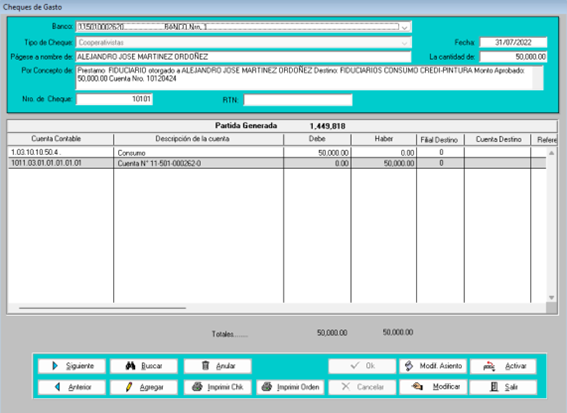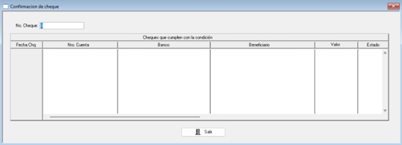 Seguidamente, ingresar el número del cheque en la casilla superior izquierda y presionar la tecla Tab, y se mostrará el cheque correspondiente, al hacer doble click en él, puede verificar todos los datos de este y realizar modificaciones. (Para mas información, diríjase al apartado de “Cheques de gasto”: