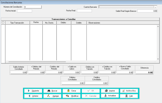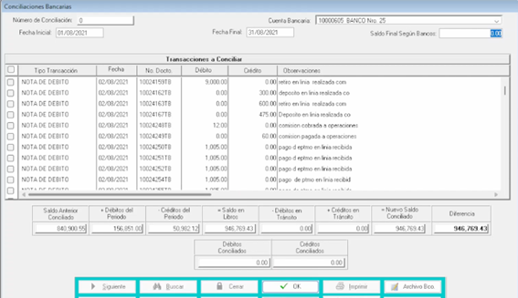 - El botón de “Actualizar” sirve para mostrar las transacciones que se han realizado después del registro de la conciliación.