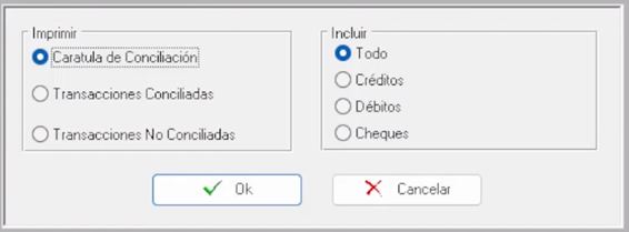 - Con el botón “Imprimir” se genera un reporte de las transacciones y deberá seleccionar qué desea incluir en este, tal como se muestra a continuación: