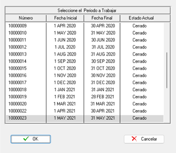 A continuación, debe elegir el período para el cual desea realizar la apertura y luego hacer clic en el botón "Ok". El sistema mostrará un aviso de confirmación para realizar esta apertura, deberá presionar el botón “Ok”. Una vez que esté abierto, volverá automáticamente a la pantalla principal, lo que indica que la operación ha finalizado.