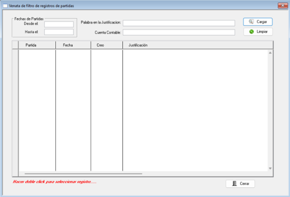 Seguidamente deberá ingresar las fechas entre las cuales se encuentra comprendida la partida que está buscando, o una palabra clave que haya en la justificación, por ejemplo (Cheque, préstamo, retiro, etc) o también ingresar la cuenta contable si la conoce. No necesariamente debe agregar los 3 parámetros, luego presionar sobre el botón “Cargar”. El sistema mostrará en pantalla la partida contable con su información correspondiente.