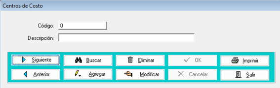 - Para buscar y/o modificar un centro de costo, simplemente seleccione el botón ‘Buscar’ y/o navegue utilizando los botones ‘Anterior’ y ‘Siguiente’ hasta ubicarlo. Una vez encontrado, presione 'Modificar' para realizar los cambios necesarios. Por último, guarde los cambios presionando 'Ok'.