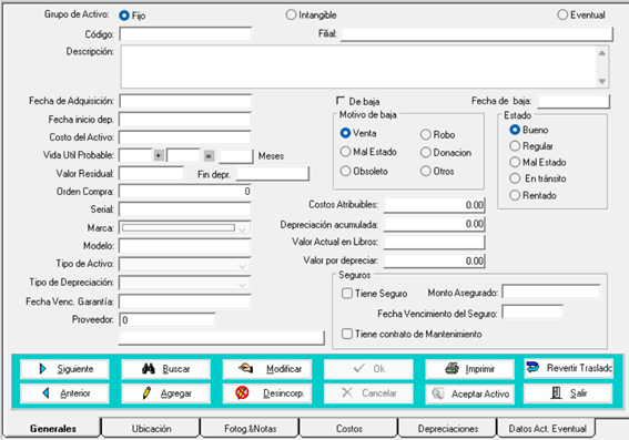 - Para buscar y/o modificar un activo, simplemente seleccione el botón ‘Buscar’ y/o navegue utilizando los botones ‘Anterior’ y ‘Siguiente’ hasta ubicarlo. Una vez encontrado, presione 'Modificar' para realizar los cambios necesarios. Por último, guarde los cambios presionando 'Ok'.
