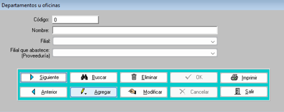 - Para ingresar un nuevo departamento u oficina, debe hacer clic en el botón "Agregar" y escribir el nombre de este, la filial a la que pertenece y la filial que abastece (proveeduría). Al tenerlo completado, debe presionar el botón “Ok”.