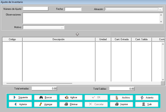 - Para agregar un nuevo ajuste, deberá presionar el botón “Agregar” y seleccionar el almacén, observaciones y el motivo de este ajuste, luego presionar el botón “OK”. Seguidamente deberá presionar el botón “Archivo” y fijarse que la flecha ubicada en el centro de la pantalla esté indicando hacia abajo, lo que significa que ahora trabajará con los datos ubicados hacia abajo en la pantalla. Luego presionar de nuevo “Agregar” y aparecerá la siguiente pantalla: