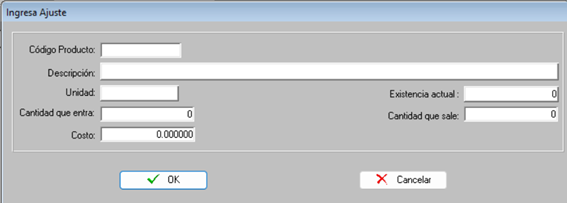Al estar ahí, deberá rellenar las casillas con el código del producto (se recomienda buscarlo con la tecla Tab y escribiendo el nombre del artículo que va a agregar, ya que al ingresarlo, automáticamente se llenan las casillas de código, descripción, unidad y existencia actual). Seguidamente debe ingresar la cantidad de producto que entra, que sale y su costo. Para finalizar, presionar el botón “Ok”.
