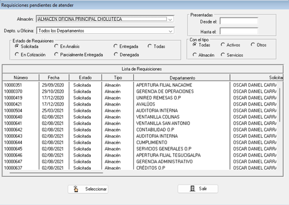 En esta pantalla podemos visualizar el estado de las requisiciones realizadas en el sistema. Para filtrarlas, podemos seleccionar el almacén para el cual estamos realizando la consulta, el departamento u oficina, la fecha en la que fue presentada, el estado de estas o el tipo.
