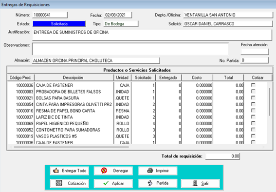 - Si desea aceptar esta requisición, ingrese las cantidades a entregar en la columna de entregado y luego presione el botón “Aplicar”. Al hacerlo, se generará el asiento contable, en el cual podrá modificar o agregar los datos. Si todo está correcto, presione el botón “OK”.