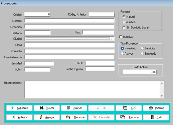 - Para buscar y/o modificar un proveedor, simplemente seleccione el botón 'Buscar' y/o navegue utilizando los botones 'Anterior' y 'Siguiente' hasta ubicarlo. Una vez encontrado, presione 'Modificar' para realizar los cambios necesarios. Por último, guarde los cambios presionando 'Ok'.