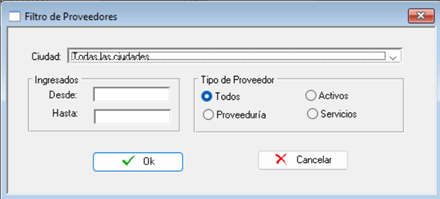 Deberá seleccionar la ciudad para la cual desea que se genere el reporte, las fechas de los ingresos que busca y el tipo de proveedor, finalmente presionar “Ok”. Luego seleccionar la opción “Screen” para tener una vista previa antes de imprimir o generar el informe.
