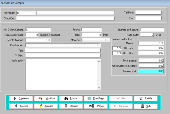 - Para buscar y/o modificar una factura, simplemente seleccione el botón 'Buscar' e ingrese el número de orden de compra o factura, también puede navegar utilizando los botones 'Anterior' y 'Siguiente' hasta ubicarla. Una vez encontrada, presione 'Modificar' para realizar los cambios necesarios. Por último, guarde los cambios presionando 'Ok'.