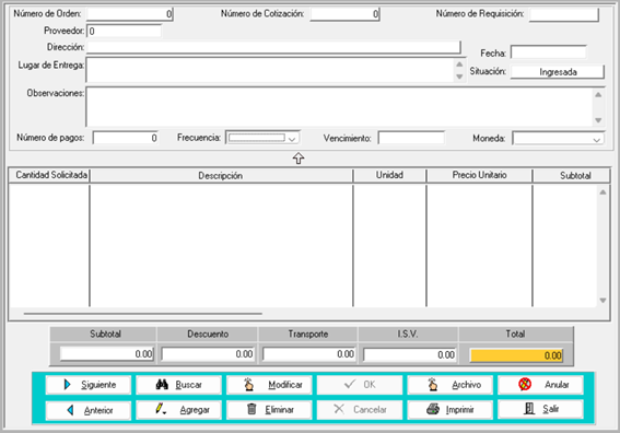 - Para agregar una nueva orden de compra, presione el botón “Agregar” y complete la información solicitada: el código del proveedor (al ingresar el código y presionar Tab, el sistema completa la información de este), el lugar de entrega, observaciones, el número de pagos, la frecuencia, el vencimiento y la moneda. Al moverse por la pantalla con la tecla Tab, llegará al final de esta, en la cual deberá llenar la información del monto de descuento, transporte e I.S.V.