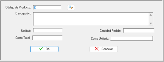Debe completar con la información solicitada: el código del producto (si no lo conoce, presione la lupa y realice la búsqueda por nombre), la descripción del producto, la unidad de medida, la cantidad pedida del producto y el costo total. Finalmente presionar el botón “OK”.