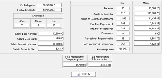 Para realizar el cálculo de las prestaciones acumuladas de un colaborador, deberá dirigirse a la pestaña de prestaciones acumuladas y presionar el botón “Calcular” que aparece en el lado inferior de la ventana:
