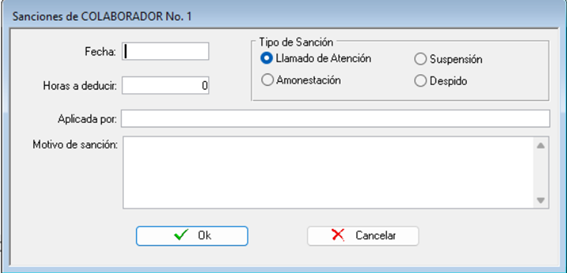 En esta pantalla podrá observar las sanciones que se le han realizado al empleado y un apartado de estadística de estas en el año, el mes y el total: