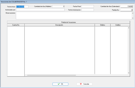 - Para agregar una nueva fecha de vacaciones, presione el botón “Agregar” e ingrese la información solicitada:
