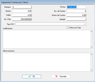 - Para agregar una nueva cuenta por cobrar, presione el botón “Agregar” e ingrese la información solicitada:
