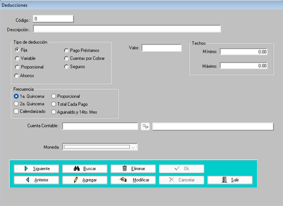 - Para buscar y/o modificar una deducción, simplemente seleccione el botón 'Buscar' e ingrese el código de esta, y/o navegue utilizando los botones 'Anterior' y 'Siguiente' hasta ubicarla. Una vez encontrada, presione 'Modificar' para realizar los cambios necesarios. Por último, guarde los cambios presionando 'Ok'.