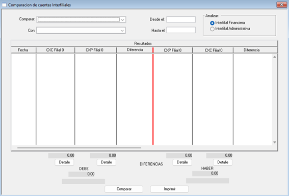 Para comenzar deberá seleccionar las dos filiales que desea comparar en las listas desplegables que aparecen en los botones de “Comparar” y “Con” y luego ingrese las fechas para las que desea comparar los saldos, seguidamente seleccionar la casilla correspondiente si desea realizar un análisis financiero o administrativo. Al tener los datos ingresados presione el botón “Comparar”.