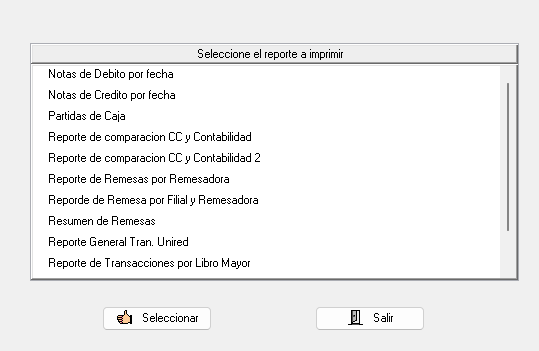 En esta ventana se tienen todos los reportes que se pueden generar en el menú de cuenta corriente; deberá seleccionar el reporte que necesita presionando el botón “Seleccionar”, y luego cumplimentar con la información que se le solicita, que podría variar dependiendo del reporte, pero que en su mayoría se refiere a fechas, filiales y cuentas. Finalmente presionar el botón “Ok” y luego “Screen”.