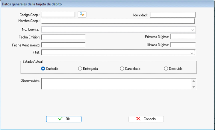 Seguidamente debe seleccionar de la lista desplegable la cuenta a la que pertenece la tarjeta, la fecha de emisión, fecha de vencimiento, primeros 4 dígitos y últimos 4 dígitos de la tarjeta, el estado actual y si una observación; para guardar presionar el botón “Ok”.