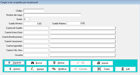 - Para agregar un nuevo cargo, presione el botón “Agregar” y cumplimente con la información solicitada: El código del cargo, el nombre, el grado, ingrese el sueldo mínimo y máximo de este cargo y seleccione las cuentas correspondientes para sueldos, horas extra, bonificaciones, vacaciones, aguinaldo, 14 mes y cesantía, presionando la tecla Tab, en la cual podrá realizar la búsqueda de las cuentas por nombre.