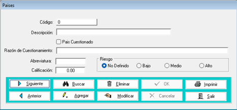 - Para buscar y/o modificar un país, simplemente seleccione el botón 'Buscar' y/o navegue utilizando los botones 'Anterior' y 'Siguiente' hasta ubicarlo. Una vez encontrado, presione 'Modificar' para realizar los cambios necesarios. Por último, guarde los cambios presionando 'Ok'.