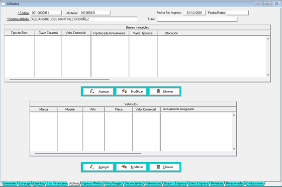 Podemos ver que los activos se dividen en bienes inmuebles y vehículos.