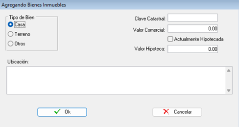 Seguidamente, deberá seleccionar de la lista de la izquierda qué tipo de bien es el que está ingresando, luego a la derecha ingresamos la clave catastral, el valor comercial, deberá seleccionar en la casilla si el bien está actualmente hipotecado y si este es el caso, ingresar el valor de hipoteca. Para finalizar, agregar la ubicación del bien en la casilla de abajo y presionar el botón “Ok” para guardar la información.
