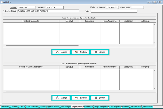 Podemos ver que tenemos dos apartados, el de personas que dependen del afiliado y abajo las personas de quien depende el afiliado.