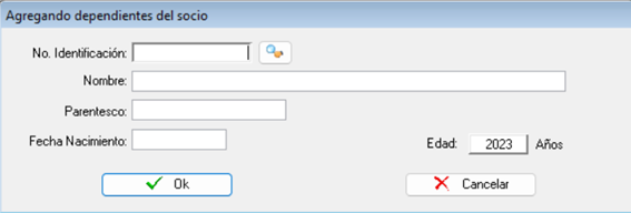 Debe ingresar el número de identificación de esta persona dependiente o presionar sobre la lupa que se encuentra al lado derecho para realizar la búsqueda por nombre o código. Si cuenta con la identidad, solamente deberá ingresarla y presionar la tecla TAB en su teclado y el sistema agrega la información restante automáticamente. Al estar completa esta información, debe agregar el parentesco con el afiliado y presionar la tecla “Ok” para guardar.